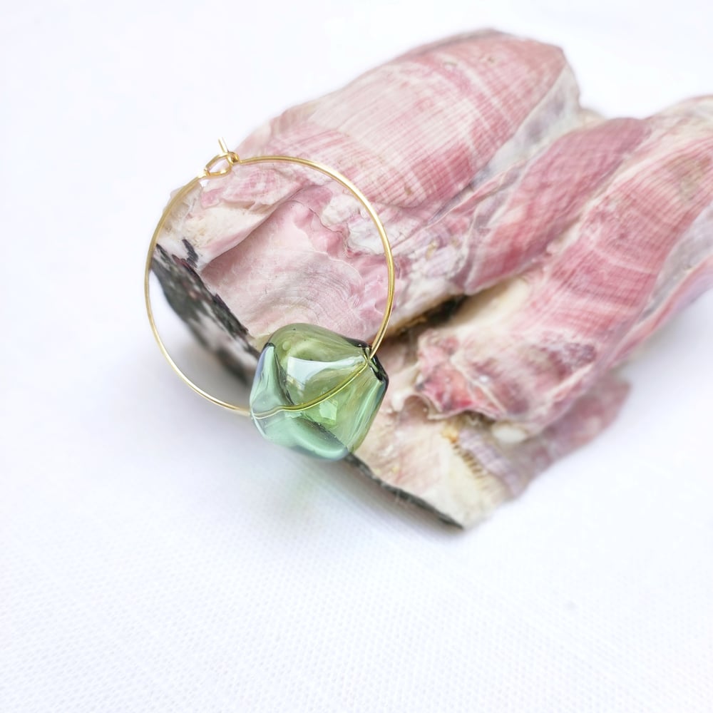 These earrings are made up of a gold-plated bronze hoop and a piece of glass measuring 1.6 centimeters. Available in various colors to choose from.