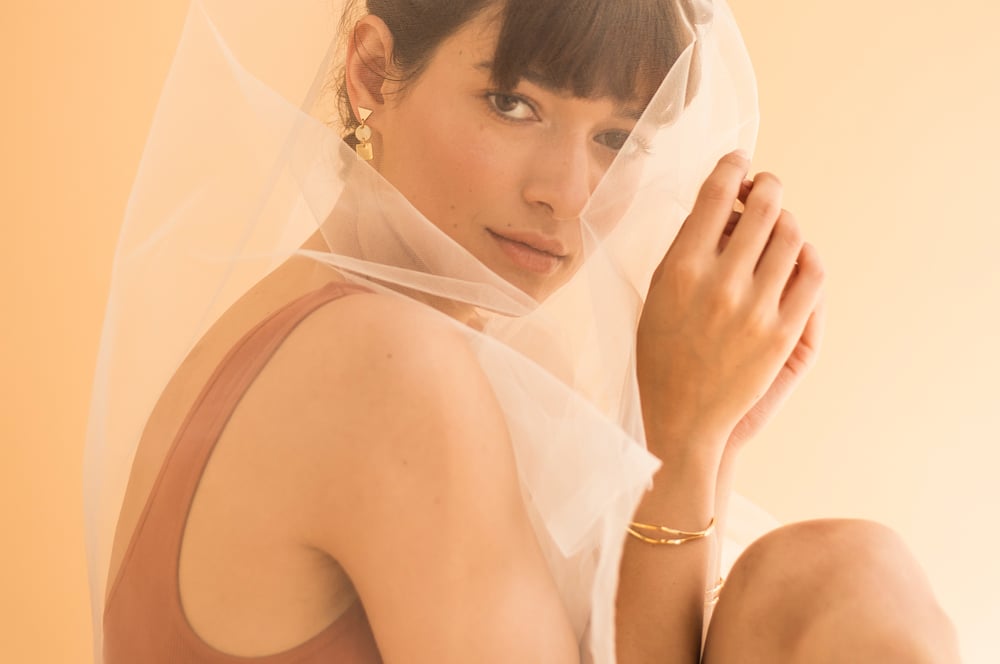 Gold earrings composed of three geometric shapes in cascade. The material is bronze with a gold bath.