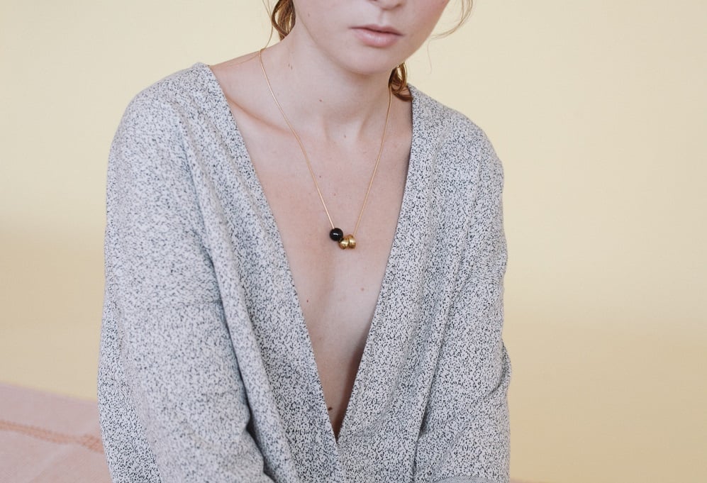 This necklace is made of two brass halfmoons and a natural stone sphere (Onyx or Angelite) of 12 mm.